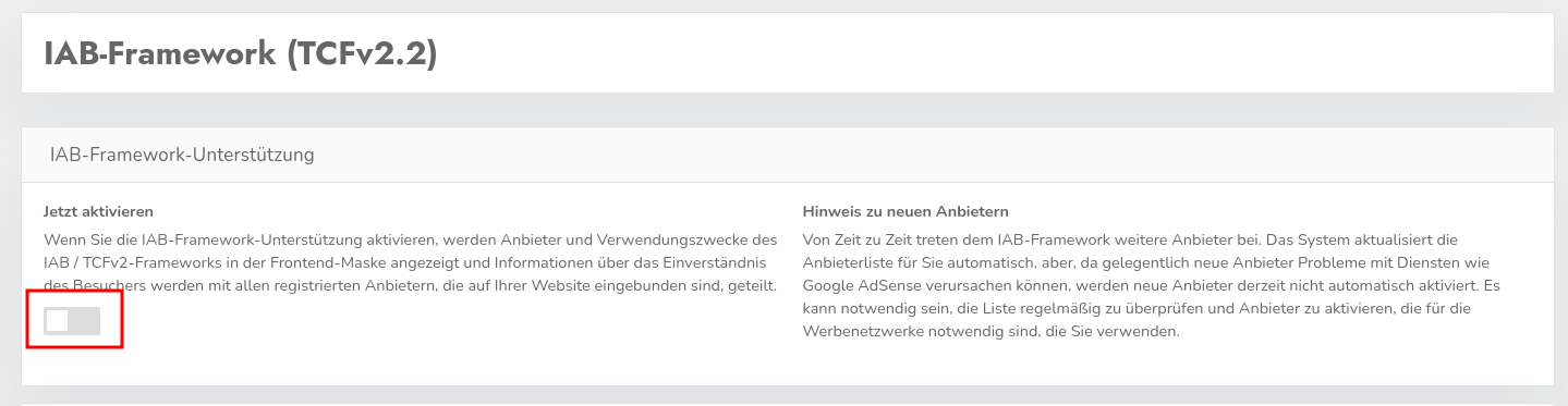 En esta opción de menú puede activar el IAB-Framework en la configuración de un dominio. Esto mostrará los proveedores y propósitos seleccionados en su banner de cookies-.\N El marco es necesario, en particular, para obtener el consentimiento para la publicidad personalizada.