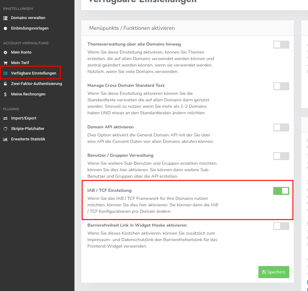Si no ve el elemento de menú en la configuración de su dominio, primero debe activarlo. Para ello, vuelva al nivel de cuenta y seleccione la opción de menú "Ajustes disponibles". La opción "Configuración IAB / TCF" debe activarse aquí para que la opción de menú aparezca para todos los dominios.