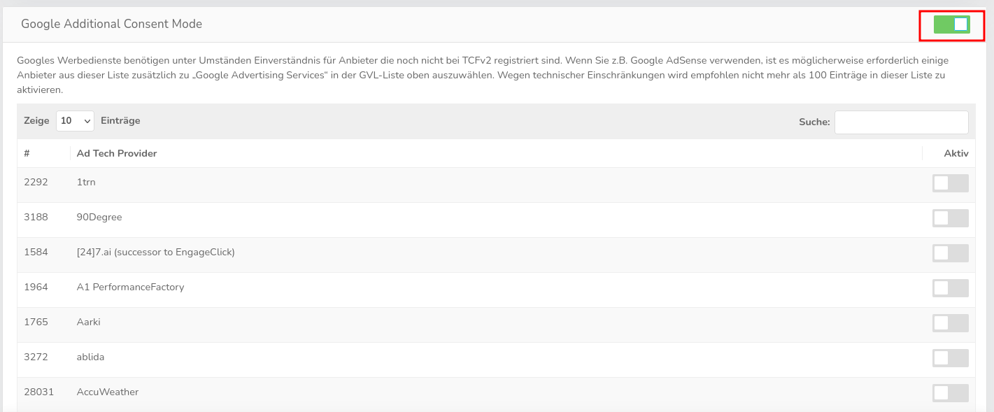 Puede utilizar esta lista para especificar qué proveedores participantes, también conocidos como vendedores, deben aparecer en su banner. Por defecto, todos los proveedores están preseleccionados aquí. Sin embargo, para que el banner sea más claro, puede ser útil seleccionar sólo los proveedores individuales para los que realmente se requiere el consentimiento para poder mostrar anuncios. Por regla general, su socio publicitario le proporcionará una lista con información sobre qué proveedores de IAB-deben activarse para la inserción de anuncios Si no dispone de dicha lista, debería dejar activada toda la selección por seguridad.