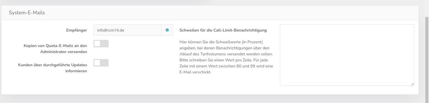 Si utiliza límites de llamadas, puede introducir aquí los umbrales porcentuales a partir de los cuales se envían los correos respectivos.