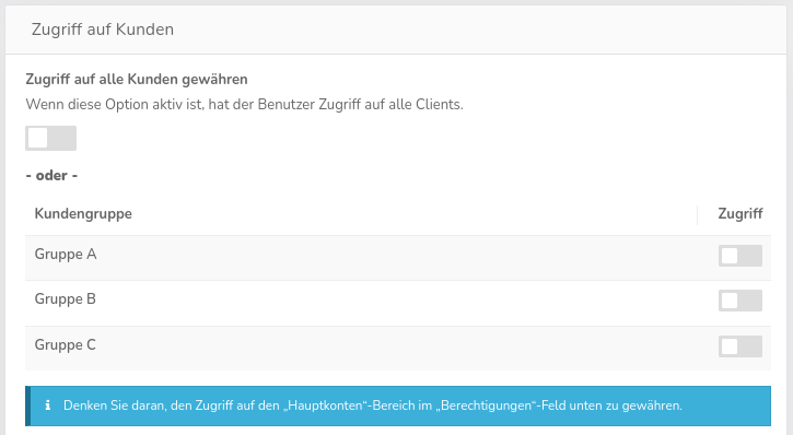 Nota: Asegúrese de activar también la opción de menú "Cuentas principales" si concede acceso a clientes o grupos de clientes específicos. Sólo así podrá el gestor llamar a la administración de clientes y acceder a los clientes liberados.