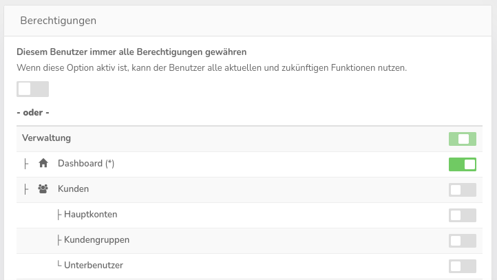La administración del gestor-ofrece una potente herramienta a través de la autorización individual de determinadas áreas para cada gestor. Para ello, puede utilizar el interruptor "Conceder siempre todas las autorizaciones a este usuario "* para habilitar todas las áreas para un gestor o seleccionar áreas específicas a las que el gestor puede acceder.