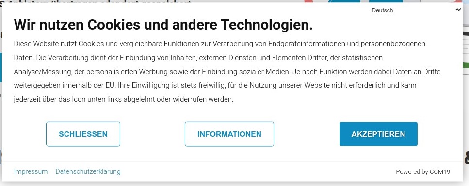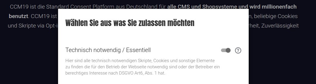 El frontend de CCM19 consiste en los widgets que puedes ver y manejar así como las funciones en el código fuente que el script implementa para realizar las funciones necesarias. A continuación repasaremos todos los puntos y mostraremos todas las ventanas que CCM19 crea.