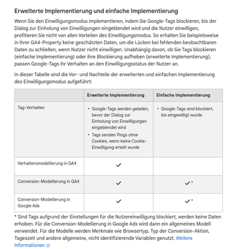 Google ofrece a los operadores de sitios web la opción de activar un modo avanzado. Para el modo básico, basta con activar los tipos de consentimiento, pero sólo permitir que las integraciones se carguen con el consentimiento del usuario, tal y como estipula básicamente el GDPR. CCM19 pone a su disposición varios métodos de bloqueo para este fin, de los cuales el script-Blocking está activo por defecto si obtiene los enlaces de nuestra base de datos.