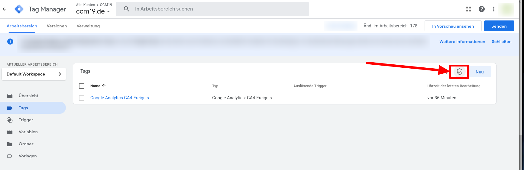 - Asegúrese de que las etiquetas pueden cargarse independientemente de CCM19 (por ejemplo, active "Todas las páginas" en Google Analytics 4).