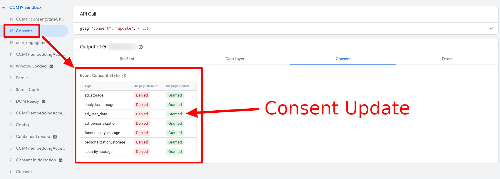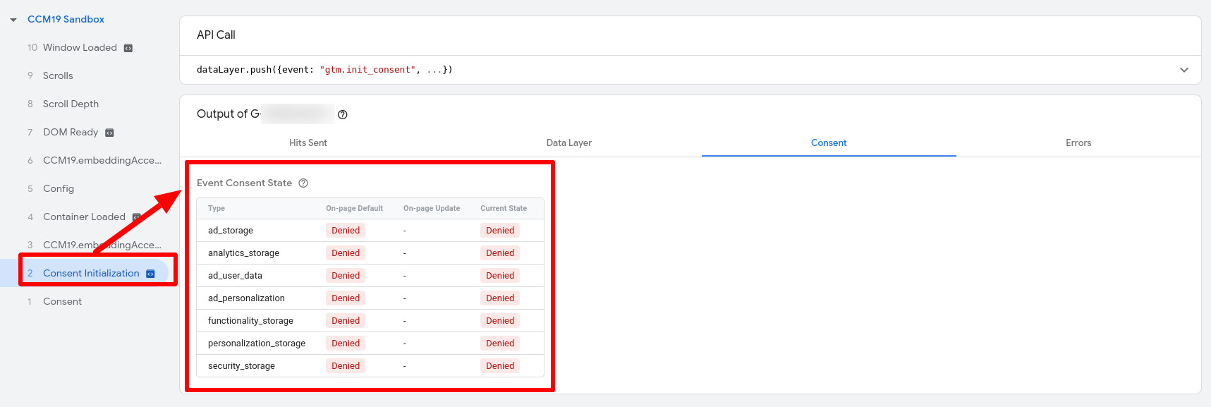 Sin consentimiento, los tipos de consentimiento reciben el estado denegado. Este cambia a concedido en cuanto se da el consentimiento en el banner.