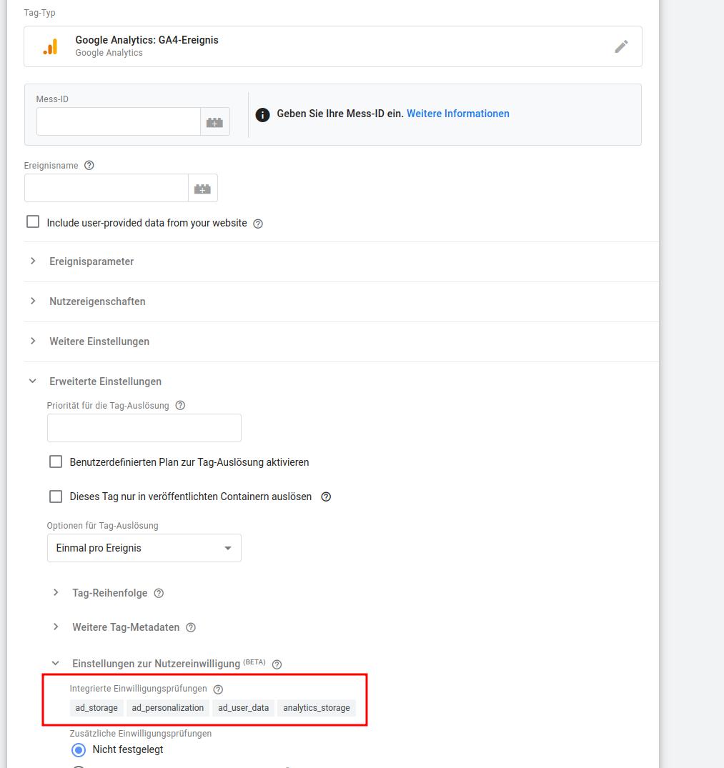 Google recomienda desactivar todos los ajustes de bloqueo del modo avanzado para que Google pueda decidir qué datos se procesan únicamente en función de los tipos de consentimiento. Esto permite a Google modelar el comportamiento del usuario sobre la base de datos anonimizados si no hay consentimiento, lo que significa que usted recibe más datos. Antes de activar el modo avanzado, pida a su abogado especializado en protección de datos que compruebe si esto cumple con la ley de protección de datos.
