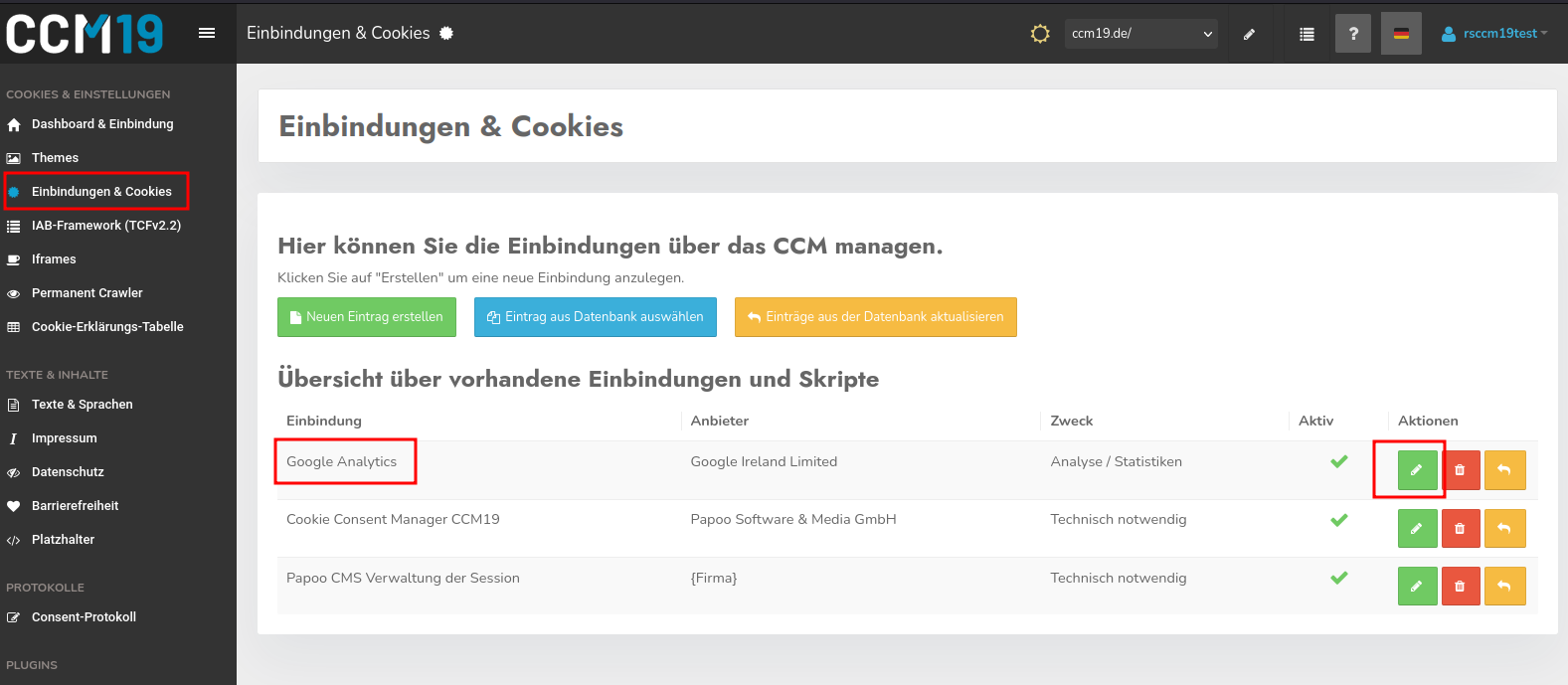 Para activar el Modo Consentimiento en CCM19, debe editar la entrada de la aplicación de Google-para la que debe activarse el Modo Consentimiento en la opción de menú "Integraciones y cookies". Por regla general, se trata de las entradas "Google Analytics" o "Google Ads Conversion Tracking".