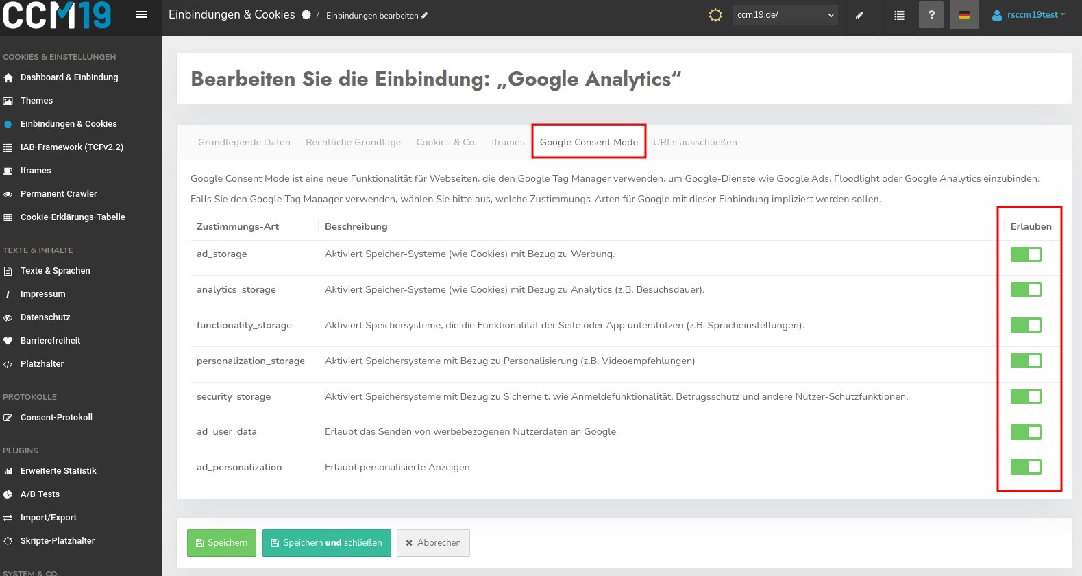 En la pantalla de edición, encontrará una pestaña para la configuración del modo de consentimiento de Google. Aquí puede activar los tipos de consentimiento. Para el Modo de Consentimiento de Google v2, las entradas "ad_user_data" y "ad_personalisation" deben estar activadas en cualquier caso. Google Analytics, por ejemplo, también requiere los tipos de consentimiento "ad_storage" y "analytics_storage".