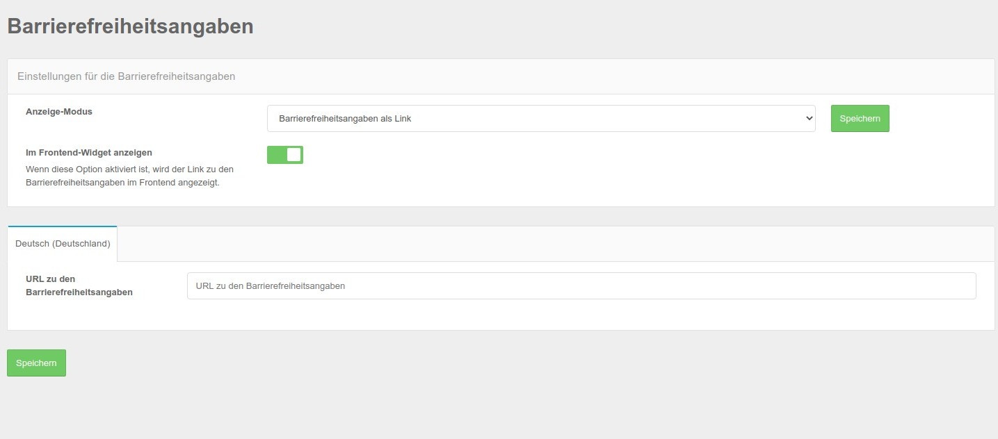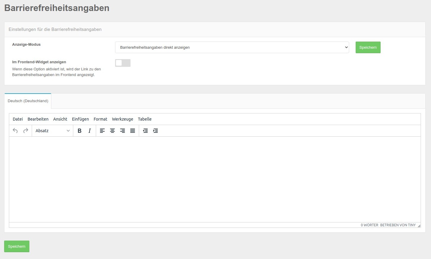 Puede introducir y editar los datos de accesibilidad directamente en la administración; la siguiente captura de pantalla muestra la pantalla de edición. Además de las opciones del aviso legal y la política de privacidad, aquí puede determinar opcionalmente si el enlace debe aparecer también en la máscara. Para ello, active el interruptor en"Mostrar en frontend-widget".