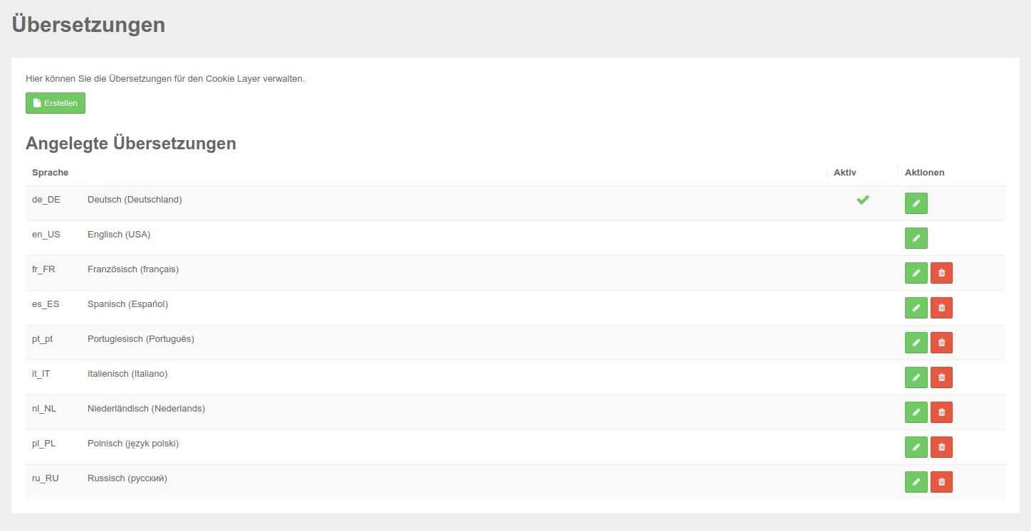 Puede ver una sección de la pantalla en la siguiente captura. Para (des)activar un idioma, haga clic en el botón "Activar traducciones". Si el interruptor está activado, el idioma estará disponible en la administración y en el frontend.