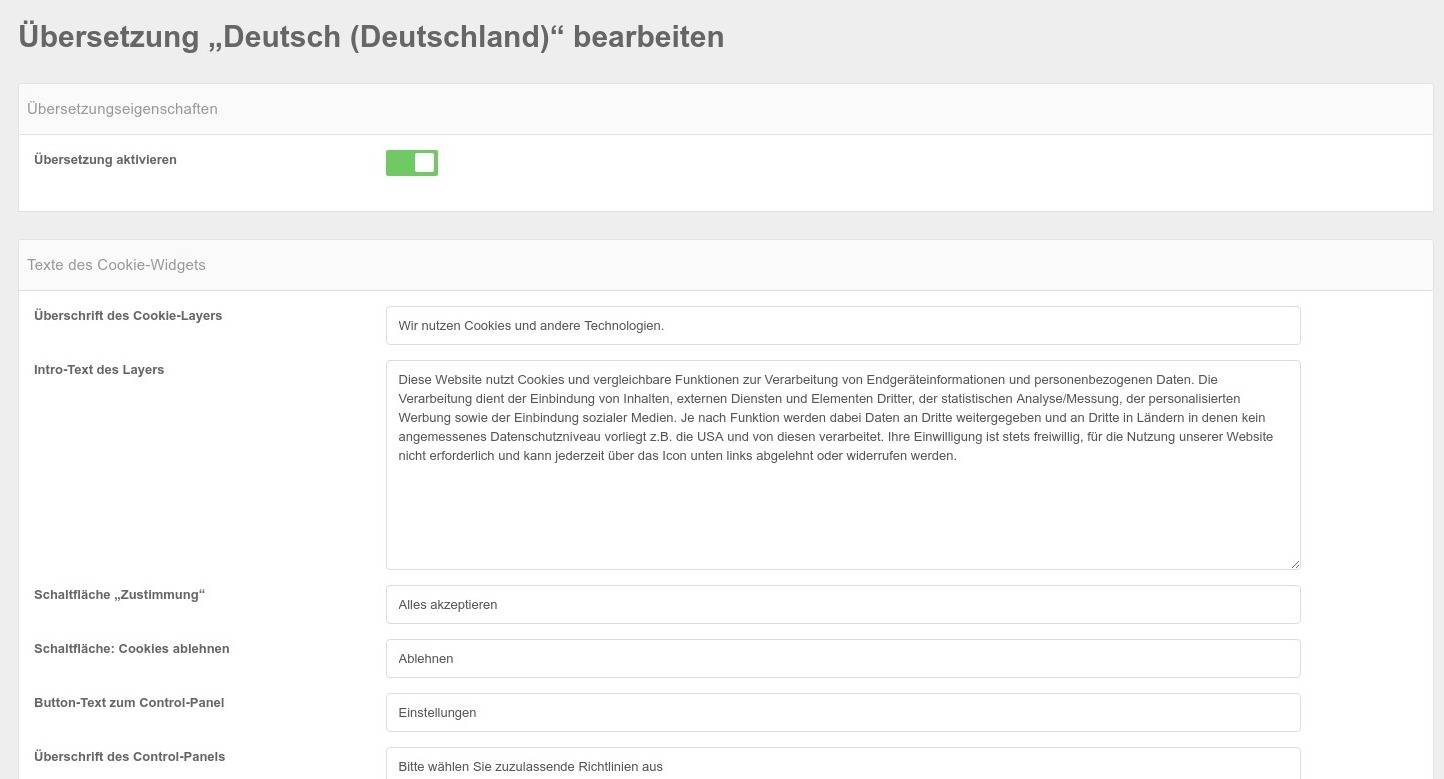 Puede personalizar los textos del widget de la cookie-, la página de detalles de la cookie-- , el bloqueador de iframe-y los textos de la categoría-. Todos los elementos se pueden encontrar en el frontend - puedes probar qué nombres funcionan mejor aquí.