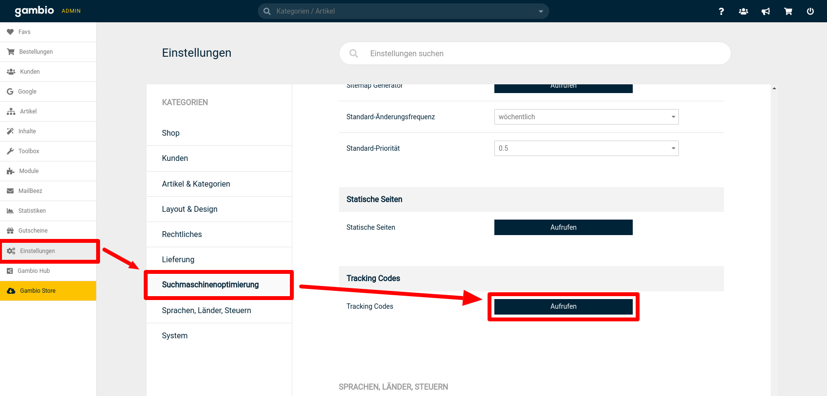 Inicie sesión en el backend. Vaya a la opción de menú "Configuración". A continuación, haga clic en Optimización para motores de búsqueda (SEO). Aquí tienes todo tipo de opciones de configuración. Desplácese hacia abajo hasta llegar a la edición del código de seguimiento.