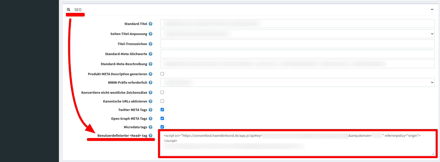 Ahora desplácese hacia abajo hasta llegar a la sección "SEO". Allí puede insertar el fragmento de código CCM19 en el campo "Custom \