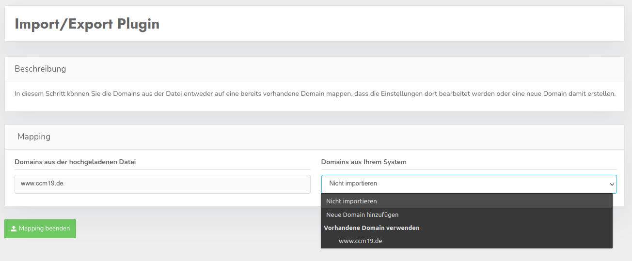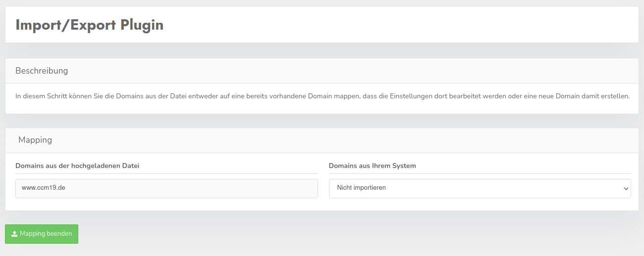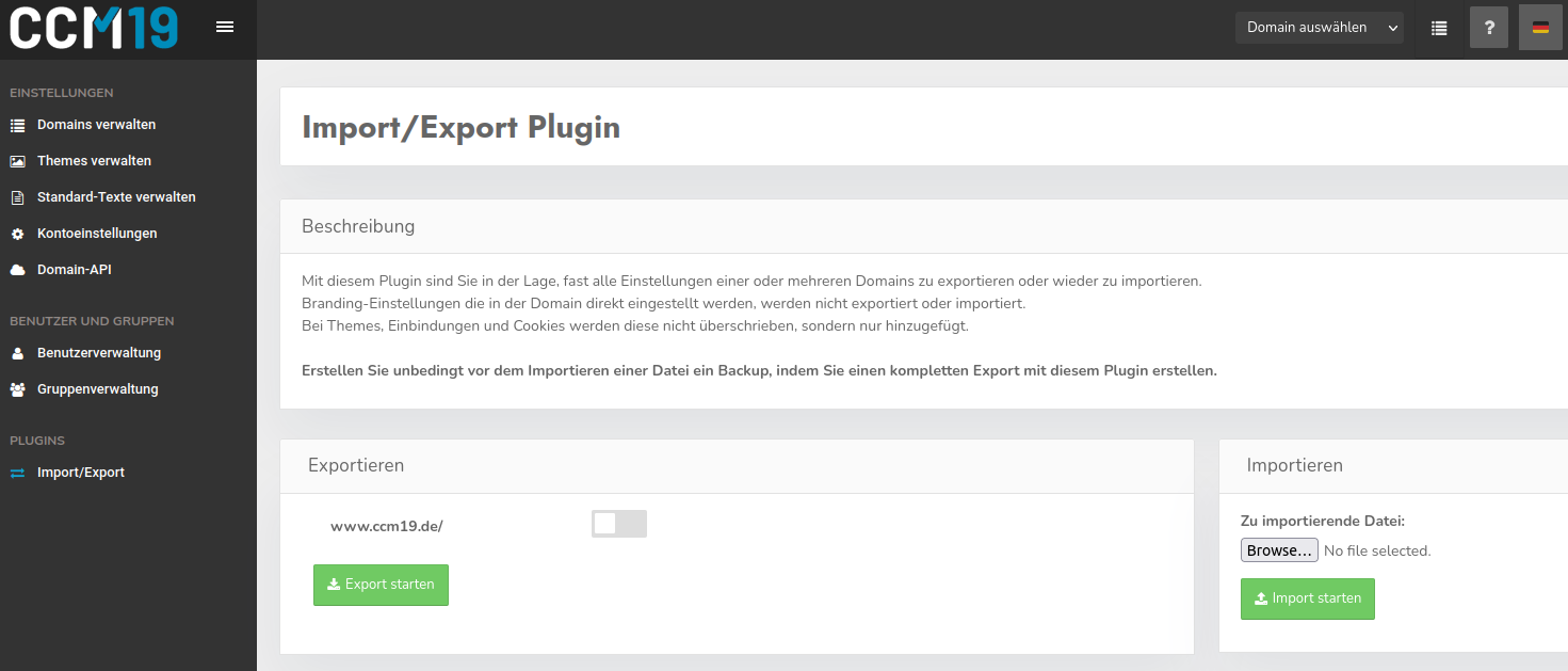 Este plugin permite exportar determinados datos de uno o varios dominios de una instalación CCM19-a través del backend. Estos datos también pueden importarse de nuevo. Todos los datos exportados se muestran como archivos .json y, por supuesto, pueden personalizarse manualmente.