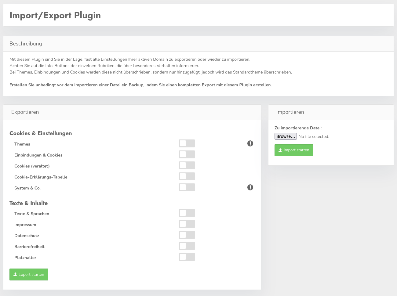 Si utilizas el plugin en un dominio, ahora tienes la opción de exportar y reimportar partes individuales de un dominio. No obstante, presta atención a los botones info-de los puntos individuales, ya que pueden proporcionar información importante sobre el comportamiento.