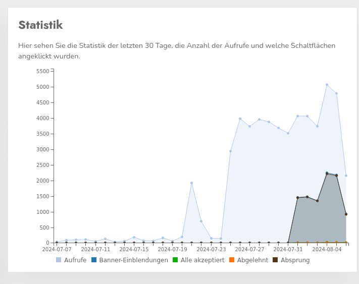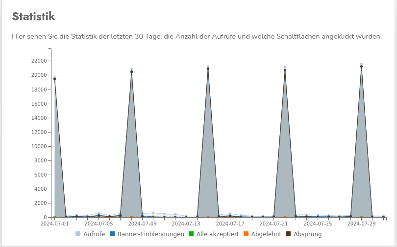 En raras ocasiones, sin embargo, puede ocurrir que el tráfico bot-también se contabilice en su cuenta CCM19-. Suele ser fácil de reconocer en las estadísticas debido a un número extremadamente elevado de visualizaciones en las que no se registra ninguna interacción con el banner. Ejemplo: