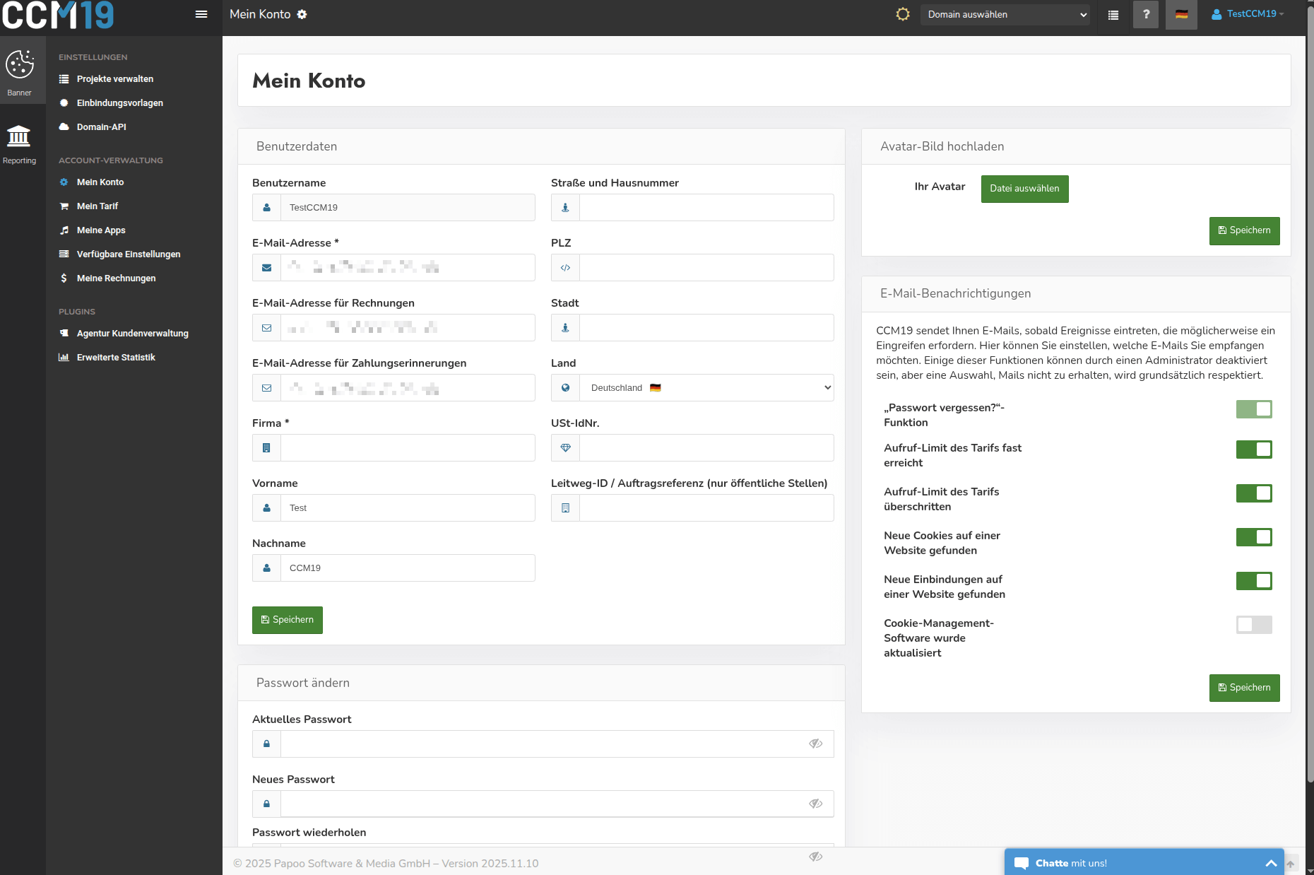 - Editar sus datos de usuario (dirección de correo electrónico-, nombres antes de-, después de- y de la empresa-, etc.)
